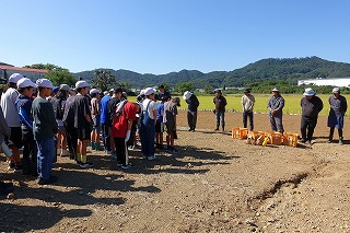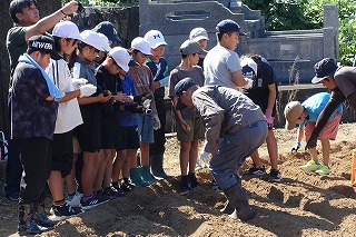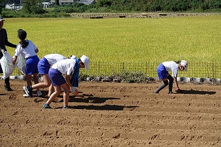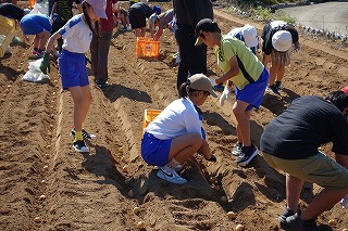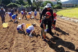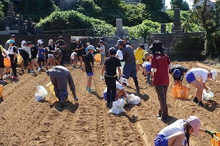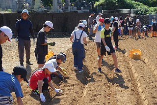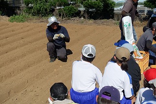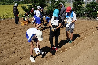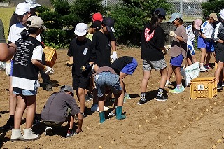 毎年、飯盛東小5年生がJAや農家の方々のご協力で、じゃがいもの植え付け、収穫作業を体験しています。種芋の準備や天候のために延期されていたので、5年生はいまかいまかと待ち望んでいた植え付けを10日金曜日に行うことができました。天気は暑いくらいの晴れ、土の状態もばっちりで、絶好の植え付け日和となりました。まずはJAの方からじゃがいもについての話を教室で聞き、いよいよプール横にお借りしている畑で植え付け作業です。あらかじめ畑は植え付けする準備を整えていただいていました。農家の方から植え付け方の説明を聞きいて作業開始です。農家の方はもう少し時間がかかるだろうと予想していたのですが、5年生のやる気と人数の多さで、気づけば種芋は畑に整然と並べられていました。農家の方々の工夫や大変さを実感するほどではないかもしれませんが、どのように作物を育てていくのかということについての学びや収穫した時の喜びなど、体験を通して学ぶことがたくさんあると思います。体験をしたからこその学び、この機会を設けていただいたJAや農家の方々には感謝しかありません。また、種芋も余ったところから頂いたと聞いています。2年生の町探検でもそうですが、周りの方々に支えられて、学校の教育活動が実施できることを実感しています。ありがとうございます。