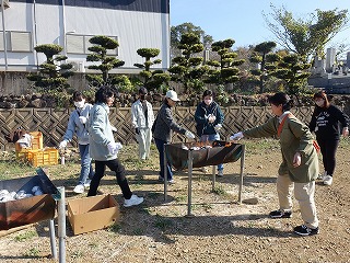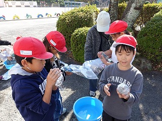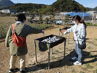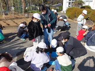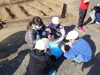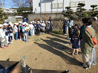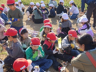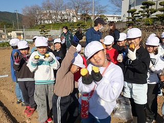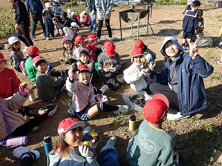 2年生が自分たちで焼き芋づくりをしました。初めて焼き芋をつくる人が多かったのかもしれません。4時間目、まずは焼き芋づくりの下準備です。濡らした新聞紙でお芋を包みます。空気が入らないように、ぎゅっと握り、その上からアルミホイルで包みます。できるだけ空気が入らないようにするのが、焼き芋を焦がさないこつです。濡れた新聞紙が柔らかくてすぐに破れ、なかなか難しかったようです。でも、たくさんの保護者のみなさんのご協力であっという間に焼き芋の下準備完了です。さあ、後はお芋を焼くだけ。子どもたちが給食と昼休み、掃除をしている間にお芋を焼きました。今日はぽかぽか、とっても暖かい日で、外で火を焚いていると暑くて汗ばむほどです。ここでも、保護者のみなさんにご協力いただきました。火のそばで「アチチ」と言いながら頑張りました。子どもたちに安心して食べさせられるように、子どもが来る前に大人で検食をちょっとだけしました。これは内緒です。さて、出来上がった焼き芋を子どもたちに配ります。もらう前からにこにこ笑顔の子どもたちですが、一口お芋をほおばった笑顔はもっともっと輝いていました。ちょっと大ぶりのお芋でしたが、みんな「あまい!」「おいしい!」と言いながら食べていました。食べ終わったあと、「今日はもう夕ご飯はいりません…。」という子、みんなで食べるお芋がおいしくて、食べ過ぎてしまったのでしょうね。2年生にとっては大満足だったのではないでしょうか。最後に、お手伝いいただいた保護者の方にお礼の言葉を言いました。おいしそうにお芋をほおばる子どもたちの顔も素敵でしたが、その様子を見守る保護者のみなさんの微笑みもとても素敵でした。ご協力いただき本当にありがとうございました。