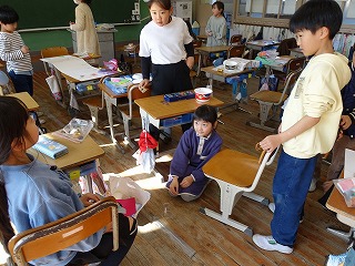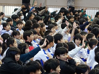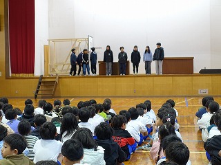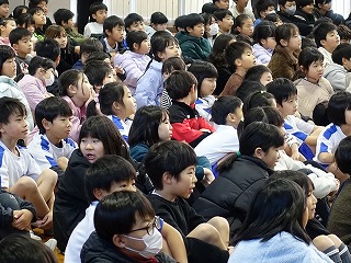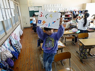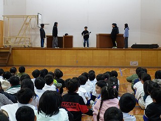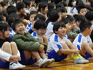 集会委員会プレゼンツのスマイル集会が朝の活動の時間に行われました。集会では、委員さんが机と机の間で物を投げ、その投げられたものを当てるというゲームをしました。みんなは投げられる瞬間を見逃さないように真剣に見つめました。委員さんが面白いジェスチャーでするものだから、みんな楽しい気分になってきます。このような取組を各委員会さんや6年生が開催してくれています。みんなを楽しませようする気持ちと行動力を、とっても頼もしく思い、誇らしいです。
