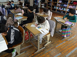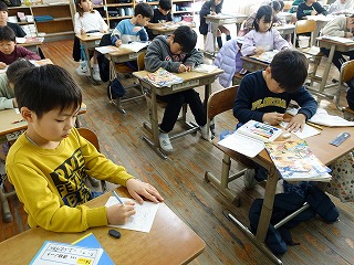 2年生の教室をのぞくと、1組は1年生をお客に行うおもちゃ大会の準備をしていました。ほら見て!と手作りおもちゃを見せてもらいました。きっと、おうちの人を招いた時の学びが今度のおもちゃ大会に活かされることでしょう。2組は、給食週間の取組として、配膳員さんへのお礼のお手紙を書いていました。とっても見やすい字でお礼の言葉をつづり、喜んでもらえるように色を塗っていました。さすが2年生です。きっと喜んでもらえることでしょう。