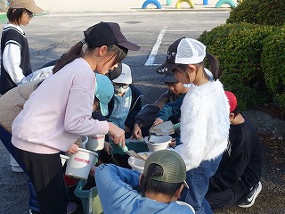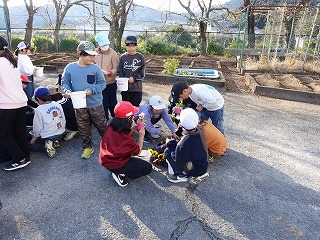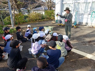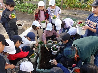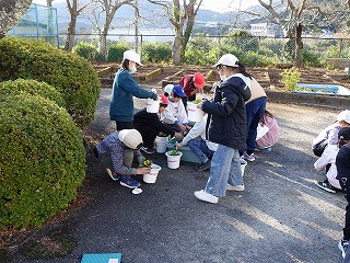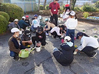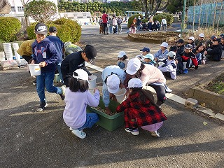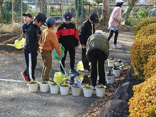毎年、この時期、一人一鉢活動に取り組み始めます。この育てた花は卒業式や来年度の入学式の式場などを飾るのに使われるのですが、子どもたち一人一人が自分の鉢に花を植え、世話するのには目的があります。一つは自分の鉢を世話することにより生き物を大切にする心や責任をもって継続してやり遂げる実践力をつけること。もう一つは卒業式や入学式で飾り6年生への感謝の気持ちや1年生を歓迎する気持ちを表すことです。各学年で取り組んでいますが、今日は3年生が鉢植えをしました。先生から、鉢の底に石を敷くこと、土を半分程度入れてから苗をおくこと、苗は手をチョキにして根元を抑えひっくり返してポットから抜くこと、花の苗の根元がしっかりかくれるように土を足すこと、と実際に鉢へ植える前に鉢植えの仕方を教わりました。さすが3年生になると、いくつもの指示を同時に聞いても、その指示通りに活動することができていました。3年生は、毎朝、畑への水やりも欠かさずしています。きっと、大切に世話をして春にはきれいな花が咲くことでしょう。