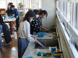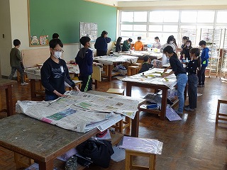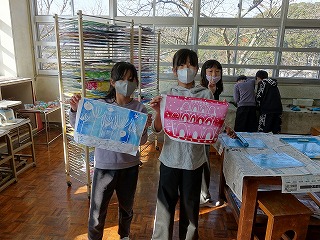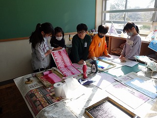 版画はこれまでもしたことがありますが、彫刻刀をつかっての版画は初めてでした。思い思いの生き物に、さらに思い思いの模様を描き、それを彫刻刀で彫りました。刃物ですから使い方のルールから真剣に学びました。ちょうど版に刷る場面におじゃましました。なかなか細かい線や曲線まで上手に彫っていました。黒いインクでなく、明るい色のインクで、さらに多色を組み合わせ、それぞれが自分のイメージに合った作品づくりが出来たようです。片付けまでがお勉強。ちゃんと自分たちで使ったものは自分たちで片付けます。