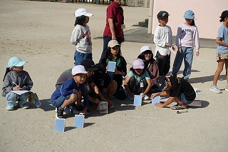 運動場では、3年生が鏡を使って光を集める実験をしていました。班で協力して一か所に鑑で反射させた光を集めます。さて、集めた光の明るさや温度はどうなるのか?外での実験というだけで気持ちが盛り上がり過ぎてしまい、実験よりも遊びに走ってしまうこともありますが3年生は違います。先生の話をしっかり聞いて、次々に実験を進めることができていました。やっぱり話を聞くという力はとっても大切だと分かります。楽しい実験ができたのは自分たちが頑張っているからです。すばらしいです、3年生!