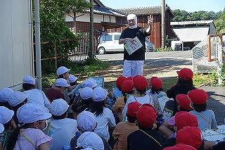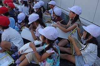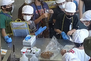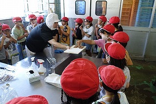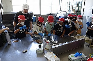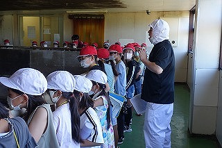 有喜の村川かまぼこへ社会科見学に行ったのは3年生です。1学期に続き、2回目の社会科見学です。本物を見て学ぶ大切な教科の学びでもありますが、同時に公共の場での過ごし方やお世話になる人々とのふれ合い方などを実践できる大切な学びの場でもあります。さて、身近な食べ物であるかまぼこがどのようにできるのか興味津々な子どもたちです。残念ながら、作業時間と見学時間が合わずに実際にできる様子はあまり見ることができませんでしたが、かまぼこの真空包装の体験をさせてもらう貴重な機会になりました。じゃこ天も一切れずつ味見させてもらいました。とってもじゃこの味が濃く、おいしかったそうです。質問にも丁寧に答えていただきとてもありがたかったです。おまけに、一人一人にお土産のかまぼこをいただきました。社会科見学でいろいろな施設や店などにお世話になると、子どもたちの学びは地域の大人に支えられていると実感します。これは学習だけではありませんね。朝の交通指導をはじめ、いろいろな場面で支えてもらっています。本当にありがたいです。2学期は、3年生だけでなく、他の学年でも校外学習がたくさんあります。お世話してくださる方にも、東小の子どもを世話して気持ちがいい!と思ってもらえるよう、気持ちのよい挨拶や返事などの態度を頑張っていきましょう。