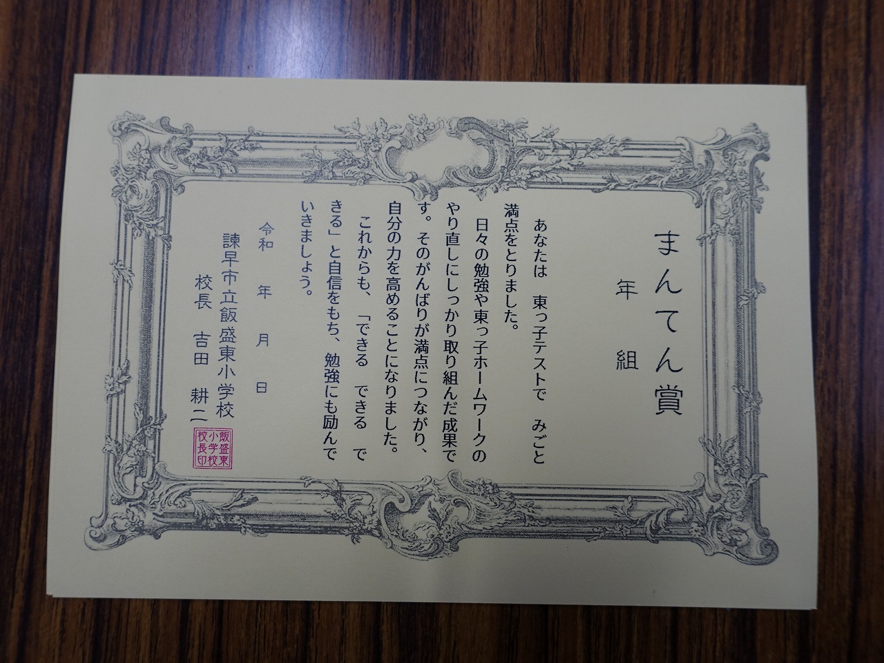 いつも東っ子ホームワークへのご協力ありがとうございます。採点していると、ご家庭で見てもらっているのだろうと思うものがあり、大変感謝しています。11月7日に安心メールにて、東っ子ホームワークの取組み方を変更することをお伝えしました。変更点は、東っ子ホームワークの採点・返却した1週間(程度)後に学級で全く同じ問題をテストとして取り組むことです。今、各学級で取り組んだテストを採点・返却しています。ほとんどの子どもがホームワークとして取り組んだ点数よりもよくなっています。少しでも励みになればと思い、1問もミスなくできた人に「まんてん賞」のミニ賞状を渡しています。もちろん、100点だけがいいのではありません。10点でも20点でも前より良くなったということは、しっかりやり直しに取り組んだ結果だと思います。その頑張りには大きな意味があり自信にしていいことです。そして、次は「まんてん賞」を!と思ってもらえるとうれしく思います。11月分のホームワーク・テストも頑張りましょう。