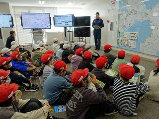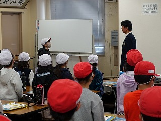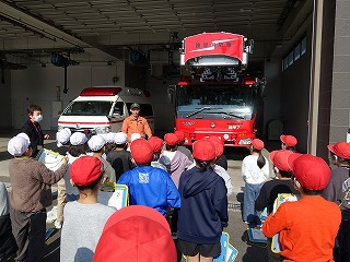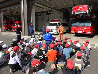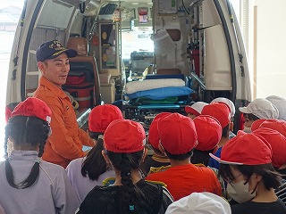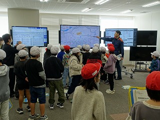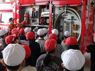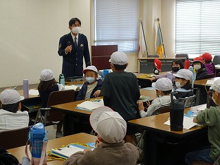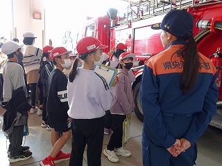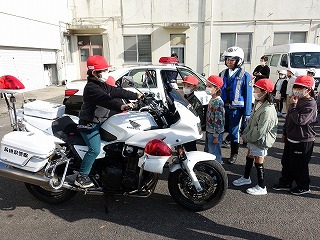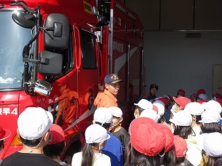 3年生は警察署と消防署に社会科見学に行きました。学校で教科書や映像を見て学習しているのですが、やっぱり本物に出会うと目の輝きが違います。本当はもっともっと尋ねてみたいことや見せてもらいたいことがあったのだけど、時間に限りがあり、残念そうでした。警察署では、特別に交通機動隊の白バイにも来てもらいました。大きな白バイに跨がせてもらったり、パトカーにも乗せてもらったりしました。消防署では通報訓練をし、実際の通信室でのやり取りを目の前で見ることができました。担任の先生が119番通報して場所を伝えると、モニターには瞬時にその場所の地図が出て、さらに一番近くにある救急車が分かるようになっていました。今回は、実際に警察官や消防隊員の方々に話を聞くことで、私たちの暮らしが守ってくれる人たちの努力を知ることができたと思います。見学中はしっかり話を聞き、一生懸命にメモを取る姿が見られました。挨拶や返事もばっちりの社会科見学でした。
