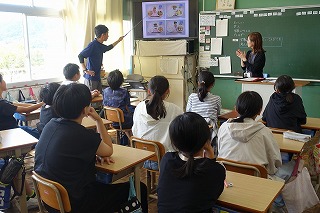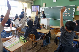 6年1組では家庭科の学習中。担任と栄養教諭の先生の2人で授業をしていました。この様な学習形態をTT(ティームティーチング)といいます。TTにもいろいろありますが、今回は教師の専門性を生かしたものと言えます。学習のめあては「栄養バランスのよい献立を考えよう」です。栄養教諭の先生が4日分の給食の写真を提示しどのようなメニューになっているかを考えるところからスタートしました。そして分かった献立のポイント①は「主食、おかず、汁物をそろえること」でした。そのあとは、実際の1食分に入っている原材料の栄養素を考えました。大きく3つに分けて考えたのですが、「これはどうだったかな…」と悩むものもあり、子どもたちも真剣に考えていたようです。