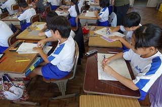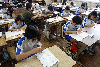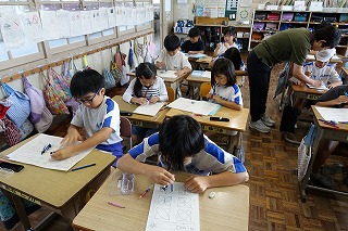 3年生が算数科で、コンパスを使った学習をしています。コンパスは円を描くだけでなく、長さを写し取ったりくらべたりする道具です。きれいな曲線が描けるのでおもしろいのですが…、扱いが難しいです。針と鉛筆の先を任意の長さにするため、コンパスを広げます。そして針を刺し、上部のつまみをもって回す方向へ傾けながら線を引きます。このつまみをもって回すのが3年生には難しいのです。力がうまく鉛筆に伝わらず薄いから何度もやり直すと、針が中心からずれます。つまみに力を入れすぎると広げたコンパスが余計に広がります。つまみは持ちにくいからと足の部分をもつと広げたコンパスが縮んだり広がったりします。今日は手本と同じような模様を描くのが課題でした。コンパスの扱いもですが、どこを中心にして針を置けばよいのかなど悩み苦労していましたが、子どもたちはとっても真剣に取り組んでいました。あきらめないで挑戦する姿はやっぱりかっこいいです。