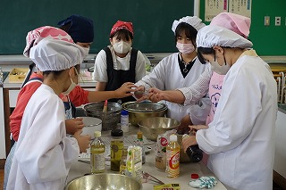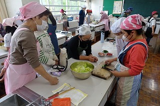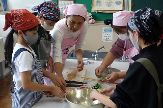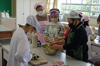 今日はクラブ活動の日、ホームメイドクラブでは、食生活改善推進協議会(略して「食改さん」)の方々にサラダづくりのご指導をしていただきました。子どもたちは、レタスをちぎったりきゅうりを輪切りにしたりしました。ドレッシングも手作りです。野菜サラダに入っていたのは、レタス、キュウリ、オクラ、ツルムラサキの葉、ミニトマト、ハムでした。少し甘めの和風ドレッシングがよく合っておいしかったです。(職員室にお裾分けをいただきました)まだ家庭科を学習していない4年生も一緒でしたから、とってもいい体験になりました。食べながら食改さんのお話も聞いて勉強にもなりました。