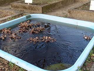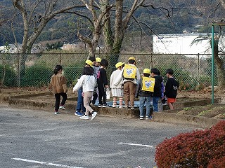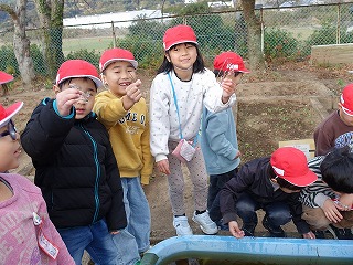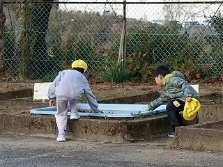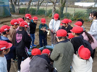 登校時のこと、花壇に水やりに行った高学年の子どもが、「先生、メダカの池に氷がはってますよ。」と教えてくれました。朝の水やりや遊びで運動場に出ている1年生に教えたのですが、「生活科の学習に役立つかも!」と1年生の担任に知らせます。きっと、朝の会の時間だっただろうに、1年生が池の氷を見に来ました。みんなで触ったので、氷が割れ、手でつまめるようになりました。ガラス板のようにきれいな氷にみんな歓声を上げます。冬の寒さを実感する自然現象でした。