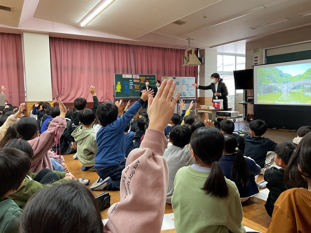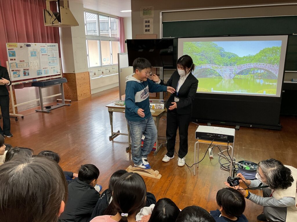 1月9日に長崎大学の学生から、眼鏡橋の歴史やつくりについてお話を頂きました。積み木で作られた即席のミニチュア橋に体重をかけて乗っても崩れなかった時には、4年生のみんなもとても驚いていました。橋の仕組みについて知る中で、防災の学習とも関連づけて学ぶことができました。