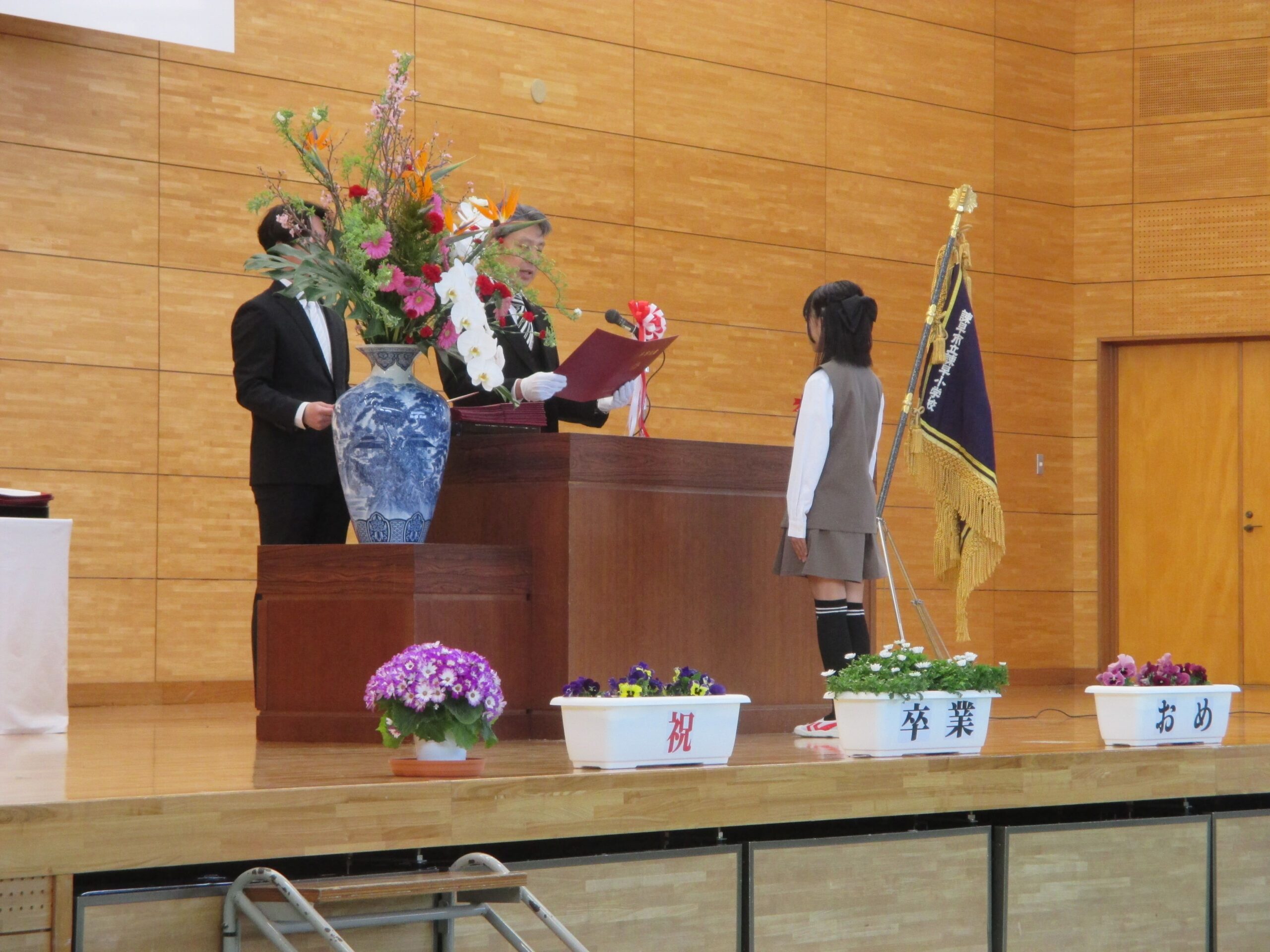 3月17日に本校体育館にて卒業証書授与式が行われました。卒業生は、緊張した面持ちの中、在校生や保護者、御来賓の方々の温かなお祝いの空気に和み、堂々と卒業式を終えました。
