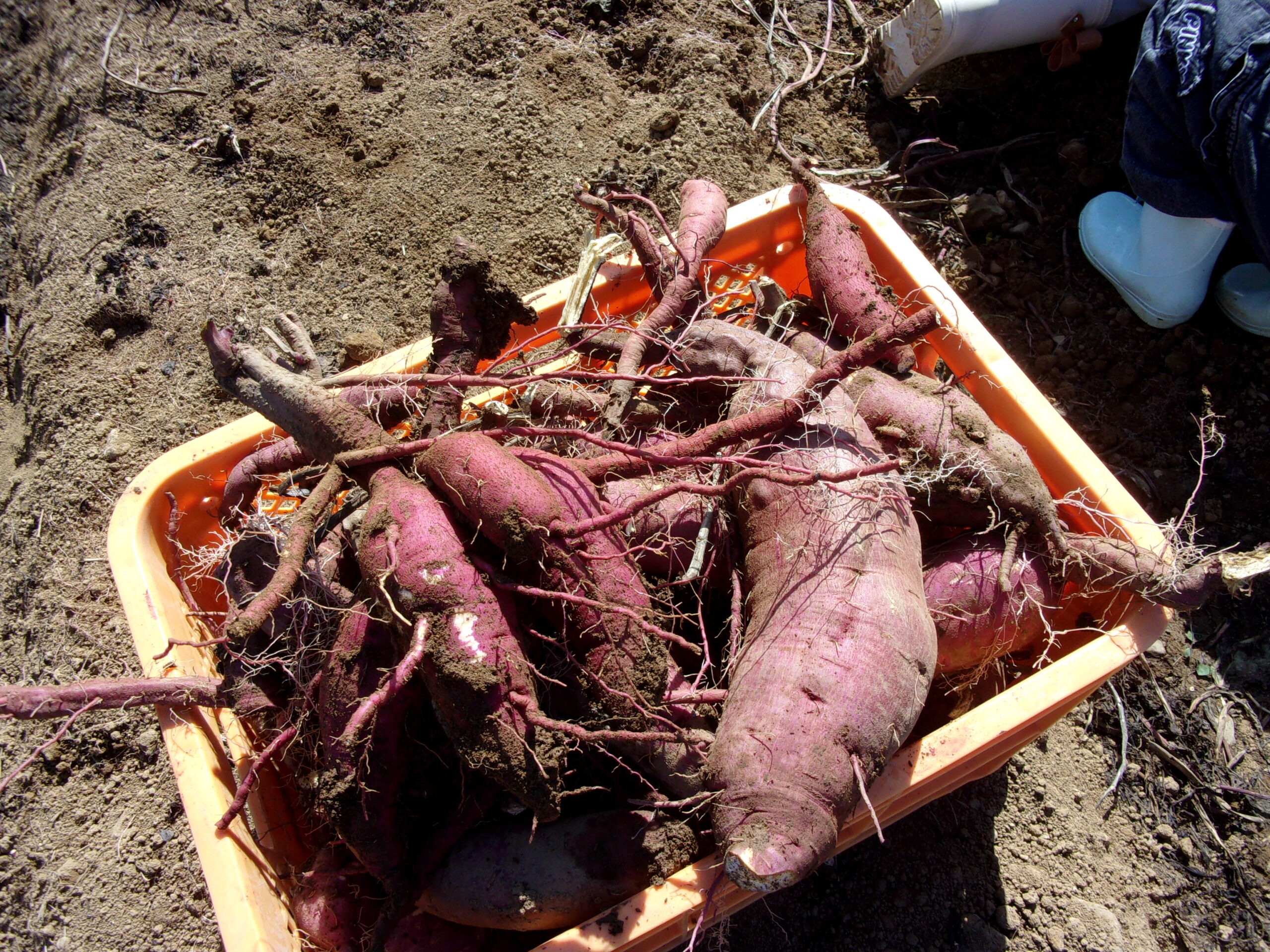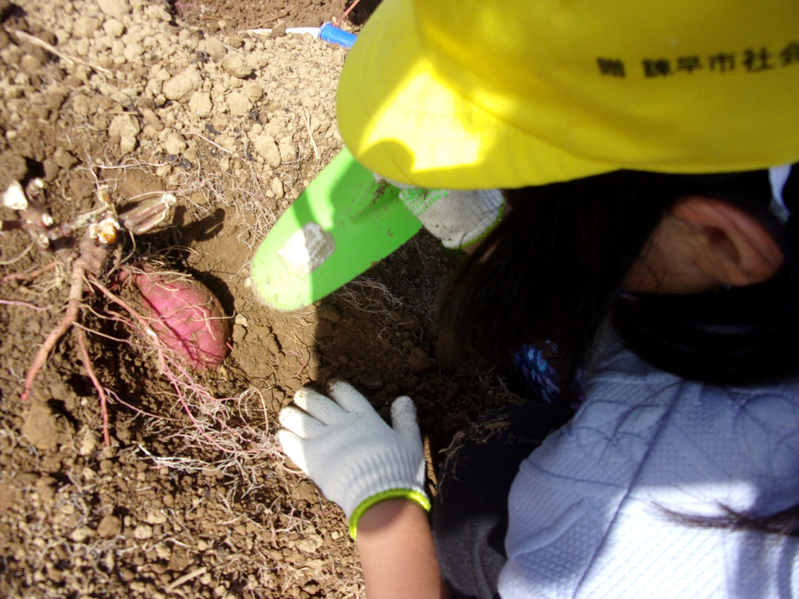 10月20日 1・2・年生が上諫早保育園の園児と一緒に芋ほりを行いました。長崎ブロイラー様のご厚意で、苗差し、芋ほりを今年もさせていただきました。大きな芋がざっくざくと採れて収穫の喜びをみんなで味わいました。