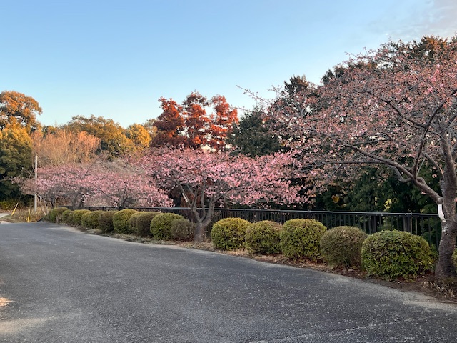 体育館横の「カワヅザクラ」(2月18日撮影)です。昨年は2月28日に色づいたつぼみが開花しはじめたのですが、今年はすでにこのような状態です。春ですね。