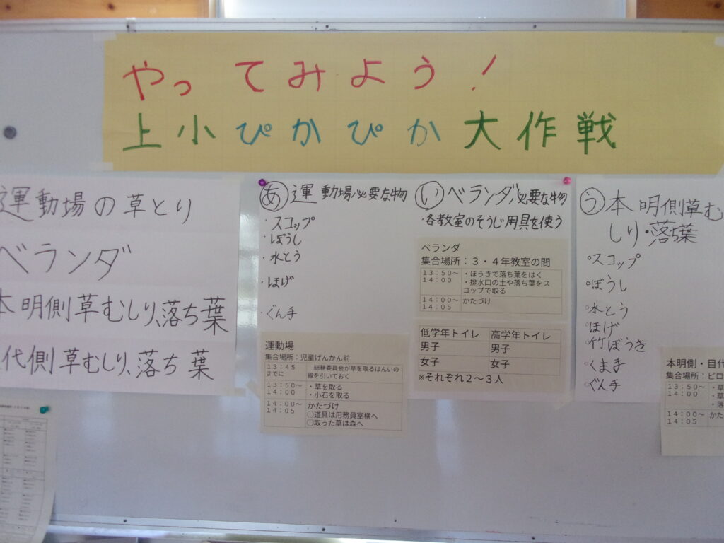 豊かな自然に囲まれ、緑の木々がもたらすすばらしさは何にも代えがたいものです。しかし、あちこち元気よく草花が生い茂り、落ち葉と一緒にあらゆるところを覆ってしまうのはどうにかしたい!児童会の総務委員会が立ち上がりました。その名も「上小 ピカピカ大作戦」毎週1回、落ち葉や草花の清掃を企画しました。清掃活動は自治的風土を高めるために、日頃から全校児童の縦割り班で行っています。ピカピカ大作戦も縦割り班で5、6年生を中心にして行います。ピカピカ大作戦の第1回目は10月24日、目代側、本明川の登校坂や階段が✨ピカピカ✨になりました。