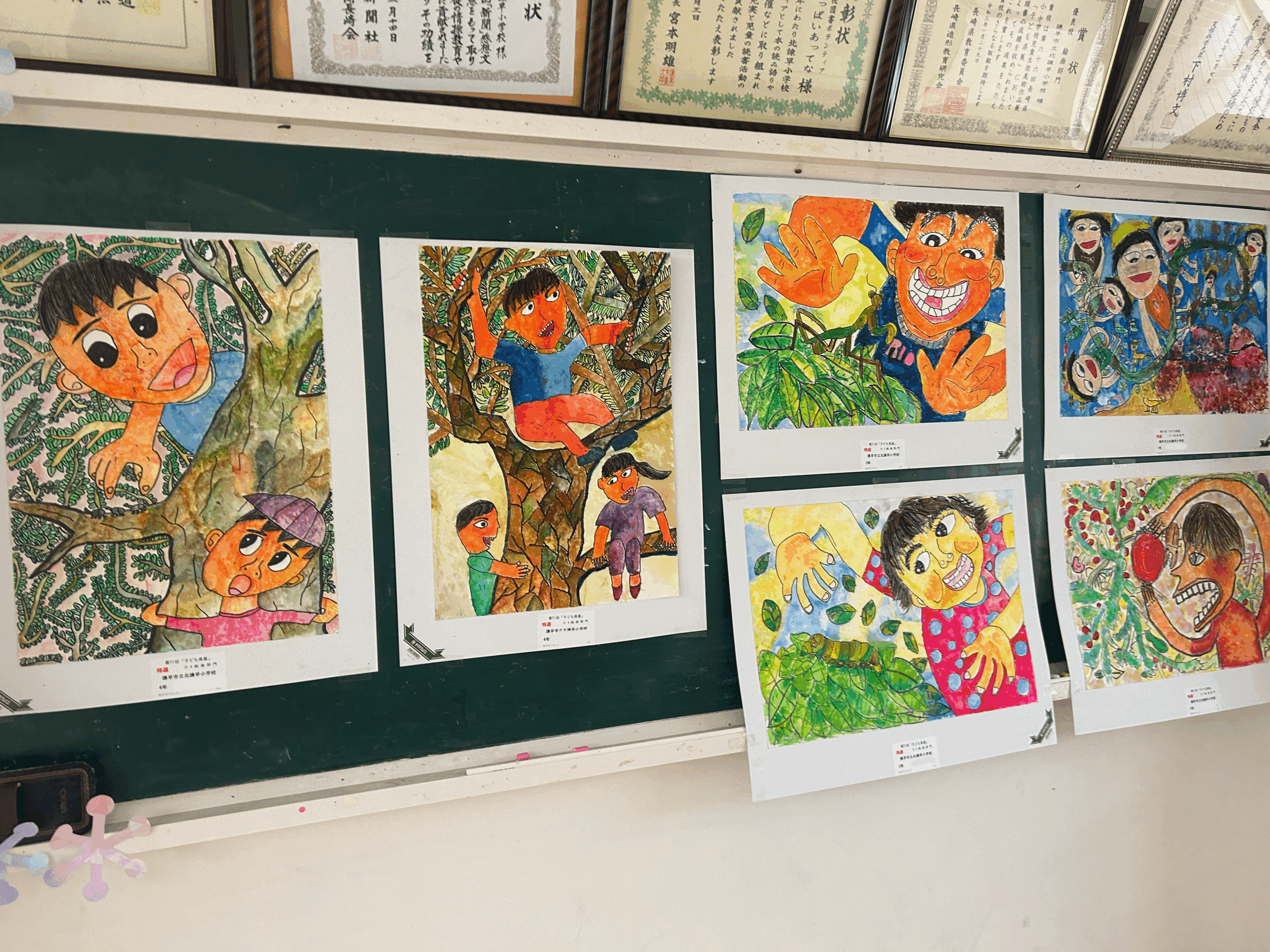 子ども県展特選の作品と諫早市小中美術展の作品が職員室前廊下に掲示されています。