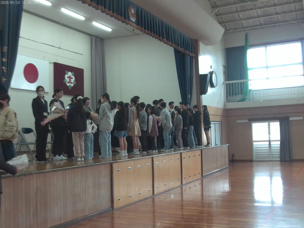 3月24日は修了式と離任式がありました。 修了式では、代表児童の1年間で頑張ったことの発表を聞き、ひとりひとりが1年間を振り返りました。 たくさん成長した姿が見れた修了式でした。 離任式では、北小を去る先生方の話を聞きいて寂しさで涙する児童もいましたが、大きな声で校歌を歌い、しっかりと見送ることができました。 1年間ありがとうございました! 投稿者プロフィール 管理者 最新の投稿 お知らせ2026年3月25日修了式・離任式 イベント2026年3月4日6年生を送る会 イベント2026年1月15日薬物乱用防止講座! イベント2025年12月10日保健集会