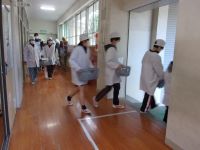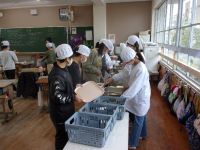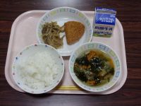 今日の給食のメニューは、ご飯、牛乳、つみれ汁、かぼちゃひき肉フライ、浦上そぼろでした。寒い日も温かい給食がおいしいです。給食当番は整然と準備をしていました。