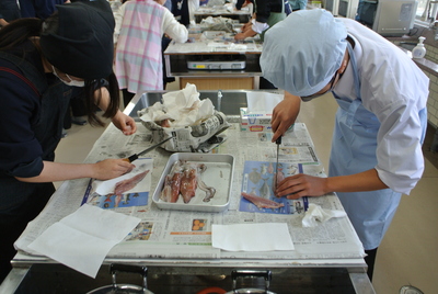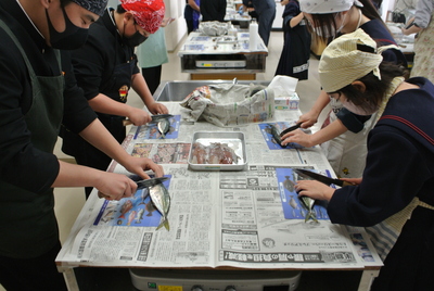 標記講習会を1年生が実施しました。今回、使用した材料は新鮮な「アジ」と「イカ」を使わせていただきました。魚を自分でさばくことが初めての生徒が多く、大変貴重な経験ができ、また良い学びになりました。生徒たちは悪戦苦闘しながらも、講師の先生の手本を参考にしながら一生懸命取り組んでいました。御指導いただきました長崎県魚市場協会の皆様をはじめ、多くの関係者の皆様ありがとうございました。