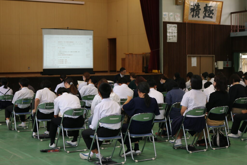 今回の説明会では、進学を控えた生徒、保護者に向けて今後の進路選択に関する情報提供や受験に関するスケジュール等の確認を行いました。生徒も保護者も真剣な表情で参加している様子でした。